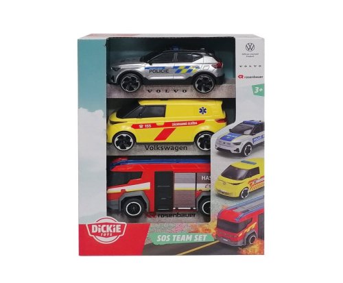 Set 3 ks dopravních záchranářských prostředků na volnoběh - hasičské auto Rosenbauer Penta, policie Volvo EX40, ambulance Volkswagen . V měřítku 1:36. Délka 15,5 cm.
