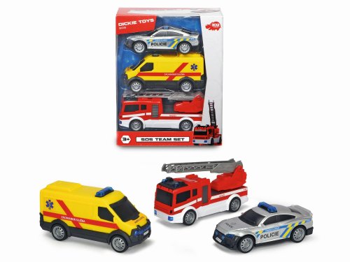 Set 3 ks dopravních prostředků na volnoběh. Hasičské auto má výsuvný žebřík. Rozměry autíček (délka x výška x hloubka): policejní auto 14 x 5 x 5,5 cm, ambulance 15 x 7 x 5,5 cm, hasičské auto 16 x 7,2 x 5,5 cm.