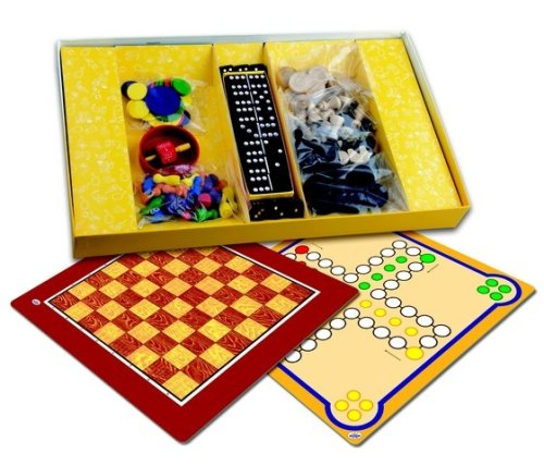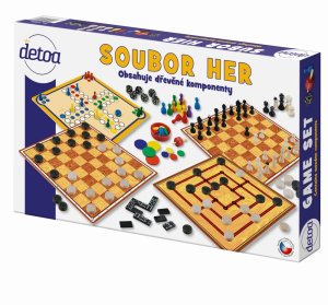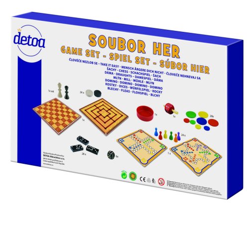 Soubor her Člověče, nezlob se, domino, kostky, šachy, dáma, bleší hra a mlýn. Součástí jsou dřevěné komponenty a hrací desky z tvrdého papíru. Nevhodné pro děti do 3 let. Obsahuje malé části. Výrobek je zdravotně nezávadný.