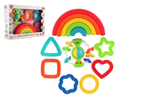 Nádherná souprava pro naše nejmenší. Sada seznamuje děti s tvary, barvami, ale také s velikostmi během hraní. Stavěj, hrkej a uč se. Sada obsahuje 12 dílů.