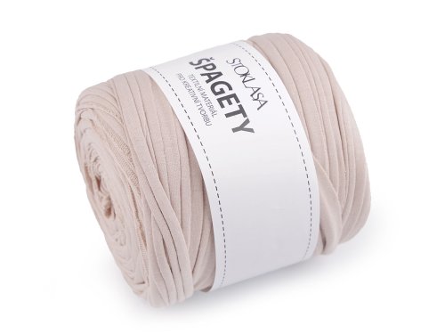 Špagetovou přízi tvoří nařezané proužky látky z recyklované bavlny. Příze je mírně elastická. Využijete ji na pletení a háčkování koberečků, dek, tašek, šál, košíků, batohů, povlaků na polštáře apod. Je příjemná na dotek, vhodná i k pletení rukama. >Velikost jehlic: 9 Velikost háčku: 8 Varianty jsou v základních barvách v různých odstínech (tmavší, světlejší, melírované).