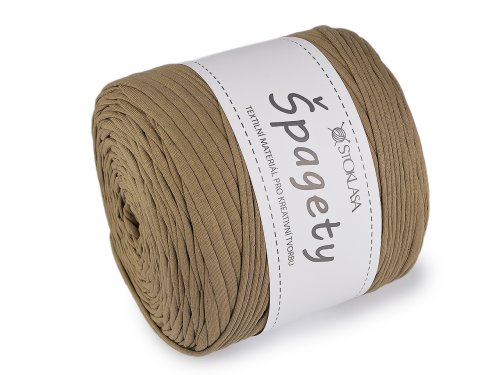 Špagetovou přízi tvoří nařezané proužky látky z recyklované bavlny. Příze je mírně elastická. Využijete ji na pletení a háčkování koberečků, dek, tašek, šál, košíků, batohů, povlaků na polštáře apod. Je příjemná na dotek, vhodná i k pletení rukama. >Velikost jehlic: 9 Velikost háčku: 8 Varianty jsou v základních barvách v různých odstínech (tmavší, světlejší, melírované).