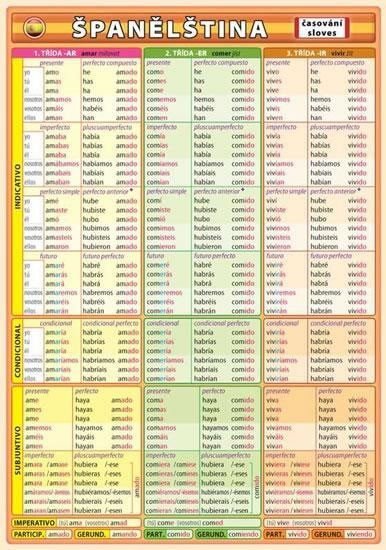 Přehledné tabulky časování španělských pravidelných sloves a pomocného slovesa haber. Pomůcka obsahuje rovněž pravopisné zvláštnosti a barevné značení koncovek a nepravidelností.