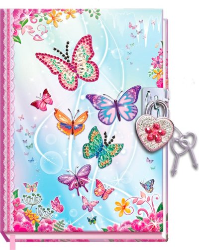 Deník s motýlky je vybaven zámkem s klíčkem, který chrání psaná tajemství před nežádoucími čtenáři. Uvnitř deníku jsou světle růžové stránky s linkováním, což usnadňuje psaní. Vazba je vyrobena z pevného kartonu. Součástí deníku jsou 2 klíče.