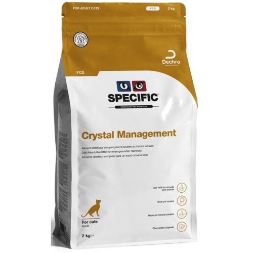 SPECIFIC® Crystal Management je kompletní dietní krmivo, které rozpouští struvitové močové kameny a snižuje riziko recidivy vzniku struvitových kamenů a onemocnění dolních cest močových u koček. Dietní krmivo díky svým vlastnostem okyseluje moč a snižuje nasycenost moči, čímž brání tvorbě struvitových krystalů. Speciální krmivo pokrývá všechny požadavky na výživu dospělých koček a přispívá k jejich zdraví. Indikace