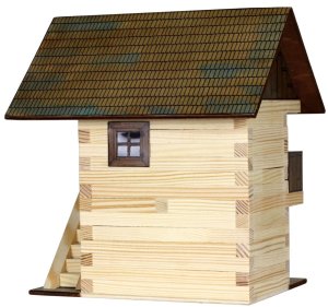 Dřevěná slepovací stavebnice Walachia - Špýchar. Slepovací stavebnice Walachia jsou dřevěné modely domečků a staveb z Valašského kraje v měřítku 1:32. Základem jsou dřevěné hranolky 9x9 mm a k tomu jsou v sadě vždy všechny papírové doplňky - okna, dveře, střešní části atd. Pro lepení se používá lepidlo Herkules, není však součástí stavebnice. Přiložený je montážní návod a malé kapitoly z historie lidové architektury. Níže je označení obtížnosti číslem 1 - 5, přičemž 1 je nejlehčí. Rozměry: 18 x 14 x 20 cm Počet dílů: 126 Obtížnost: 3