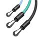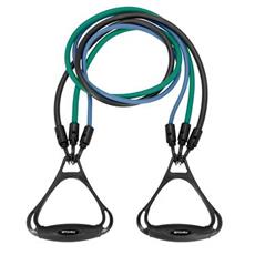 Set obsahuje tvarované a pohodlné rukojetí a 3 odnímatelné gumy, kde každá guma má jiný stupeň odporu. Díky tomu lze libovolně nakombinovat a nastavit až 7 různých obtížností a přizpůsobit tak intenzitu tréninku vašim potřebám: