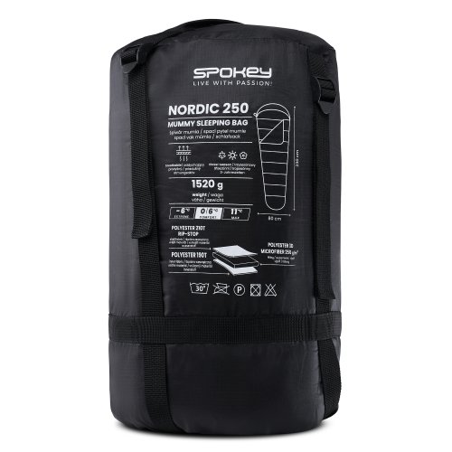 Spací pytel Spokey NORDIC 250 je nezbytnou součásti vybavení během kempování. Je vyroben z těch nejkvalitnějších materiálů, díky čemuž má zvýšenou odolnost proti mechanickému poškození a roztržení. Použitá výplň 3D Microfibre zajišťuje dokonalou teplenou izolaci. Spací pytel dokonale chrání před chladem a skvělé se hodí pro chladné jarní či podzimní noci. NORDIC 250 je zabalen v kompresním vaku a váží pouze 1520 g, díky čemuž nezabírá mnoho místa v batohu a nepředstavuje žádnou zbytečnou zátěž.