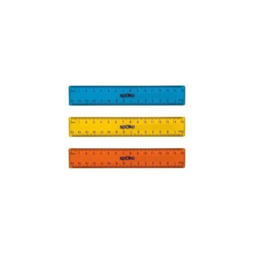 Ploché, základní pravítko s předtištěnou stupnicí o délce 15 cm. Praktická velikost pro školní penál. Zkosená hrana pro přesnější a pohodlnější rýsování. • měřítko: 15 cm • materiál: pevný a odolný polystyren • předtištěná stupnice • mix barev: žlutá, modrá, oranžová