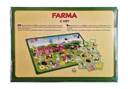 Společenská hra FARMA je určena pro 2 - 6 hráčů starších 5 let. Součástí hry jsou pestré kartičky zvířat, které dětem poskytnou zábavu i poučení. Obsah je herní plán, 70 kartiček, 6 figurek, hrací kostka a návod ke hrám.