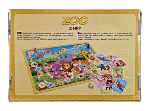 Společenská hra ZOO je určena pro 2 - 6 hráčů starších 5 let. Součástí hry jsou pestré karty se zvířátky, které dětem poskytnou zábavu i poučení. Obsah je herní plán, 34 karet, 6 figurek, hrací kostka a návod ke hrám.