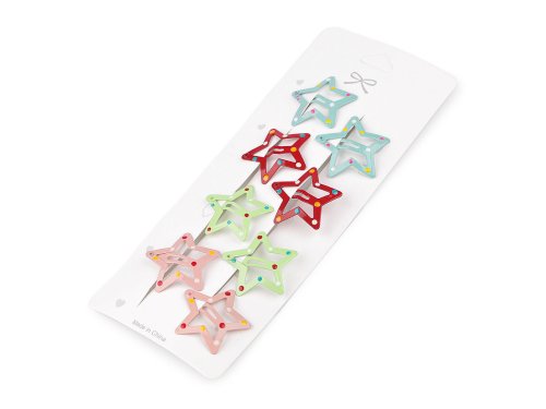 Malé sponky pukačky s hvězdou se hodí do jemných dětských vlásků. Udrží i jemný pramínek vlasů. Jsou vyrobené z kvalitního materiálu, který dlouho drží svůj tvar, funkčnost i barvy. Na každé kartě je 8 ks sponek po 4 párech. Papírová karta má výsek pro zavěšení a vystavení sponek na prodejní stojan.