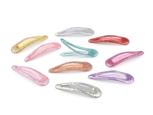 Mix různě barevných sponek pukaček s glitry ocení malé i větší slečny, které se rády blýsknou. Sponky jsou vyrobené z kvalitního materiálu, který dlouho drží svůj tvar, funkčnost i barvy. [Glitry neopadávají, pevně drží.] Na kartě je 10 ks sponek. Karta má výsek pro zavěšení a vystavení sponek na prodejní stojan.