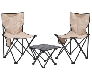 Zažijte pohodlí a praktičnost s naší kempingovou soupravou, která obsahuje dvě židle a jeden skládací stůl.