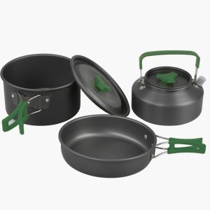 Kempingový set nádobí, příprava jídla až pro 3 osoby, skládací rukojeti, kompaktní provedení, odolná hliníková slitina a plast, rovnoměrný ohřev.