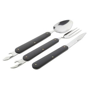 Skládací kempingová příborová sada z nerezové oceli s hliníkovými držadly, 300D polyester Včetně vidličky, nože a lžíce v černém obalu Rozměr: 11 x 7 x 2 cm