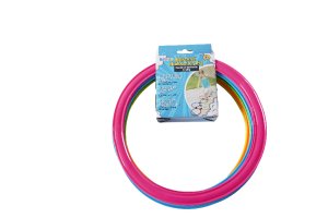 Barevné plastové kruhy, které se poskládají libovolně na zem a můžou se pomocí svorek spojit, aby držely u sebe.