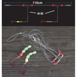 Návazcová souprava. Má dva háčky, které jsou od hlavní návazcové šňůry odděleny vloženým drátem proti zamotání.