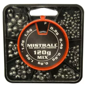 Praktická sada olověných bročků Mistrall o celkové hmotnosti 120 g v pevném plastovém dávkovači.