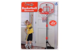 Hra basketbal pro menší děti. Materiál je plast a balení obsahuje vodou napustitelný stojan, tyč rozloženou na 3 dílky, obruč, síťku, desku, míč o průměru 12 cm a pupmičku.