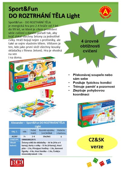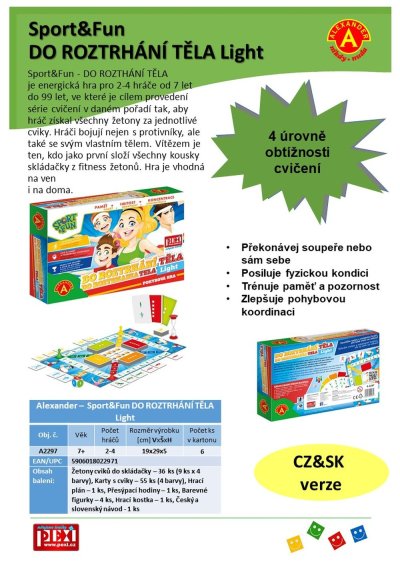 Sport&Fun - DO ROZTHÁNÍ TĚLA je energická hra pro 2-4 hráče od 7 do 9 let, ve které se pohybují po hrací ploše, sbírájí fitness žetony, ale především dělají fyzické cviky. Hráči bojují nejen s protivníky, ale také se svým vlastním tělem. Vítězem je ten, kdo jako první složí všechny kousky skládačky z fitness žetonů. Hra je vhodná na ven i na doma.