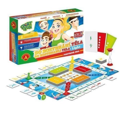 SportFun - DO ROZTHÁNÍ TĚLA je energická hra pro 2-4 hráče od 4 do 9 let, ve které se pohybují po hrací ploše, sbírájí fitness žetony, ale především dělají fyzické cviky. Hráči bojují nejen s protivníky, ale také se svým vlastním tělem. Vítězem je ten, kdo jako první složí všechny kousky skládačky z fitness žetonů. Hra je vhodná na ven i na doma.Energická hra pro 2-4 hráče od 4 do 9 let, ve které je úkolem provádění různých cviků v daném pořadí. Cílem je získat všechny žetony za jednotlivé cviky. Vítězem je ten hráč, který získá sadu osmi žetonů a žeton „Pohá vítězů“. Tato hra vyžaduje nejen pozornost a dobrou paměť, ale i sílu, pohybovou koordinaci a fyzickou zdatnost.V případě, že hrají hráči různého věku, mohou se domluvit, že starší hráči budou provádět více cviků např. dvojnásobek cviků zobrazených na kartě.Soutěžte nejen s ostatními hráči, ale také sami se sebou!Jak získáte žeton do skládačky a vyhrajete hru?Deska, pro pohyb figurek, obsahuje pole s obrázky hvězd (2 až 5) a ikony různých fyzických aktivit. Počet hvězd na poli označuje, který ze 4 typů cvičebních karet sejmete z balíčků karet. Čím více hvězd, tím více cviků bude sestava obsahovat a obtížnější jí provést. Ikona na políčku označuje, který žeton do skládačky získáme. Každý hráč musí sbírat 8 různých žetonů tvořících skládačku a žeton Pohár vítězů. Ten může získat až po shromáždění všech osmi dílků skládačky.Průběh hry:1. Umístěte desku na rovný povrch.2. Umístěte žetony a figurky na určená místa na desce. Žetony s pohárem vítězů na střed hrací desky plochy a ostatní žetony nech vedle hrací desky.3. Hráči postupně házejí kostkou a postupují firgurkou o počet polí, který padl na kostce4. Vezměte kartu spočtem hvězdiček, který je na políčku, kde stojíte.5. Zapamatujte si pořadí cviků z karty a proveďte je během doby měřené přesýpacími hodinami nebo aplikací Alexander Timer (k dispozici ke stažení na Google Play nebo App Store nebo QR kódem v návodu hry).6. Pokud se hráčovi podaří provést uvedený sled cvičení v odměřeném čase, obdrží žeton s ikonou vyznačenou na poli, kde stojí.7. Po získání všech 8 žetonů skládačky se hráč přesune na počáteční pole a zamíří do středu hrací plochy, aby získal vítězný dílek s pohárem.8. Ten, kdo vyhraje žeton s pohárem, vyhrává hru.Stejně jako všechny hry ze série SPORT FUN, poskytuje nejen skvělou rodinu mezi přáteli a rodinou, ale také posiluje naši fyzickou kondici a pomáhá vytvářet zdravé návyky.Balení obsahuje: Žetony cviků do skládačky – 36 ks (9 ks x 4 barvy), Karty s cviky – 55 ks (4 barvy), Hrací plán – 1 ks, Přesýpací hodiny – 1 ks, Barevné figurky – 4 ks, Hrací kostka – 1 ks, Český a slovenský návod - 1 ks