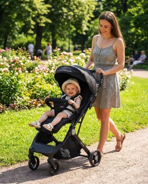 Po složení je kočárek mimořádně kompaktní, praktický a velmi lehký – váží jen 7,4 kg – ideální pro skladování a přepravu, ať už v kufru auta nebo při cestování letadlem. Díky integrované rukojeti jej lze pohodlně táhnout jako kufr.