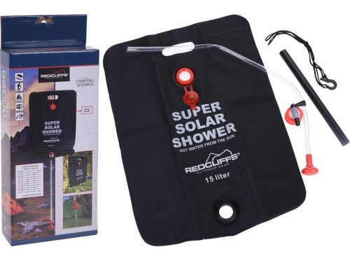 Solární závěsná sprcha 15 l, která je ideální pro kempování, nebo i pro použití doma na zahradě. Sprcha dokáže ohřát vodu až na 40 - 60° C, dle intenzity slunečního záření.