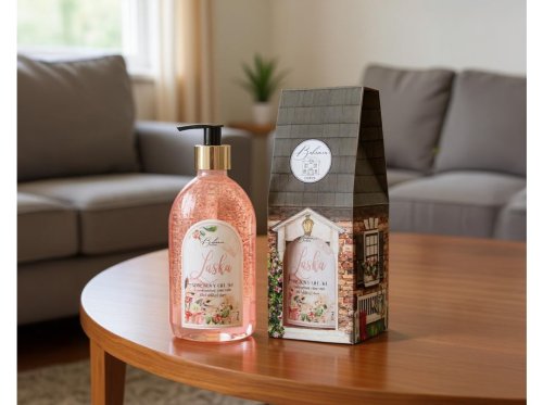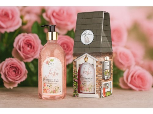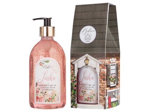 Luxusní sprchový gel 3v1 s extrakty šípku a růže 500 ml je vhodný na tělo, vlasy i ruce. Stylový obal ve tvaru domečku s nápisem LÁSKA.
