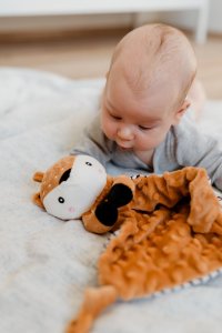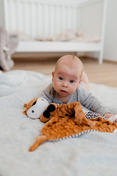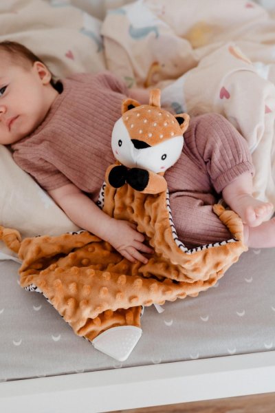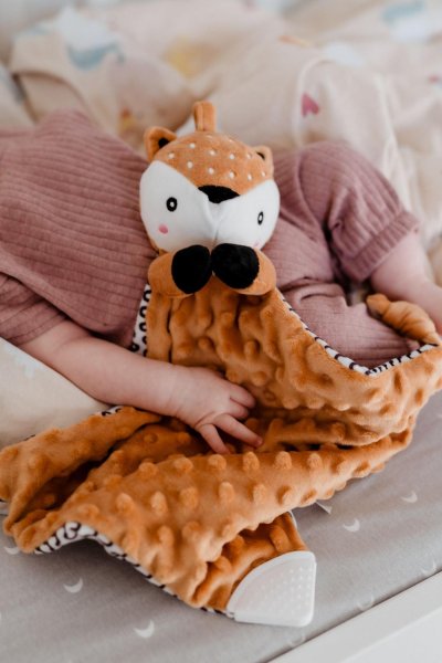 Roztomilý plyšový usínáček ve tvaru srnečka je ideálním společníkem pro nejmenší miminka již od narození. Měkoučká látka typu minky s 3D puntíky poskytuje příjemný dotek, který miminko uklidňuje a podporuje jeho smyslový rozvoj. Součástí je také měkké kousátko vhodné při prořezávání zoubků a jemné chrastítko, které podporuje zvědavost a rozvíjí sluchové vnímání. Usínáček je navíc certifikován v ČR, takže splňuje přísné požadavky na bezpečnost pro ty nejmenší.