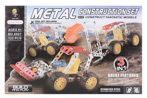 Kovová šroubovací stavebnice obsahuje 122 dílků. Můžete si postavit tři druhy stavebních strojů. Rozměr balení cca 31,5 x 20,5 x 4 cm. Věk 8+