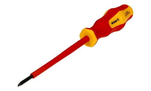Šroubovák je vyroben z kvalitní CrV oceli, což zaručuje jeho pevnost a odolnost. Díky VDE certifikaci je zajištěno bezpečné použití při práci na elektrických zařízeních do 1000 V (1 kV). Plochý izolovaný šroubovák. Tento plochý elektrotechnický šroubovák je nástroj s plochou čepelí určený pro práci s elektrickými součástmi. Plochá čepel se používá k manipulaci a utahování šroubů s drážkovými otvory, tedy plochých šroubů. Šroubovák je vybaven izolovanou rukojetí z materiálu, který zajišťuje elektrickou izolaci a chrání uživatele před úrazem elektrickým proudem, přičemž umožňuje bezpečné uchopení. Elektrické šroubováky se široce používají při práci s různými elektrickými komponenty, jako jsou elektrické zásuvky, spínače, desky plošných spojů, kabely a další podobné součásti.