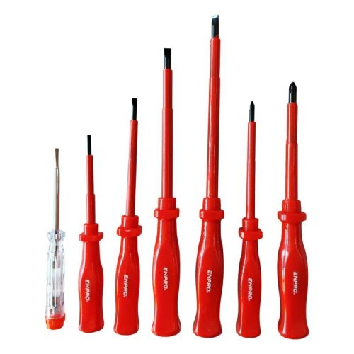 sada elektro šroubováků ENPRO - 7 ks certifikace elektro VDE 1000 V, IEC/EN 60900 - 2004 kovový dřík vyroben z velmi kvalitní chromvanadiové oceli kalený hrot je magnetický ergonomicky tvarovaná rukojeť …