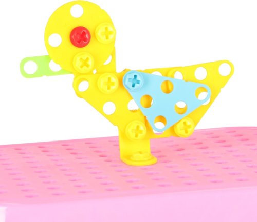 Procvičování manuální zručnosti a jemné motoriky, kreativity a poznávání tvarů, praktický plastový kufřík sloužící jako kreativní "plátno" a úložný prostor, barevné bloky a šrouby se vkládají pomocí šroubováku nebo bateriové vrtačky do otvorů v kufříku, kartonové figurky s tematikou jednorožců umožňují vytvářet 3D díla.