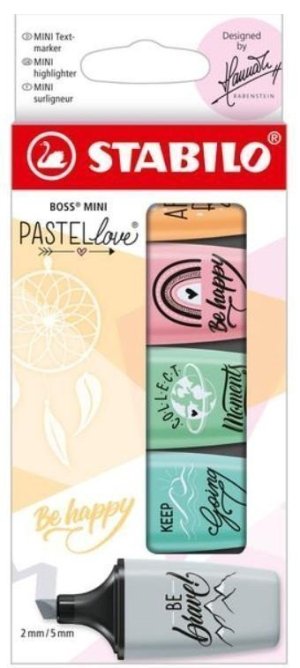 Pastellove STABILO BOSS MINI je novou verzí známých zvýrazňovačů BOSS MINI. * Proměňte každý text ve skutečný poutač! * Známá kvalita velkého STABILO BOSS v praktickém mini formátu. * Podtržení a zvýraznění díky dlátovému hrotu se dvěma šířkami psaní: 2 a 5 mm. * Nebojte se, když necháte čepici na chvíli staženou, zvýrazňovače lze odvíčkovat až 4 hodiny, aniž by vyschly, díky technologii proti vysychání. * Snadno se vejdou do pouzdra na tužky a jsou ideální na cesty. * Inkoust na vodní bázi. * Pastelové barvy dělají zvýrazňování a podtrhávání textů extra zábavu. * S odlišným potiskem na téma „zůstaňte pozitivní“ – umění zůstat optimistou v náročných časech.