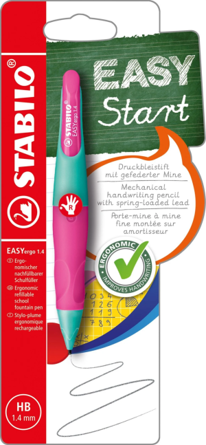 Grafitová tužka STABILO EASYergo je speciálně určená pro školáky, kteří jsou v psaní již pokročilejší. Je ergonomicky tvarovaná a opatřená příjemnou úchopovou zónou vyrobenou z neklouzavého materiálu, která odpovídá velikosti dětské ruky a intuitivně ji navádí ke správnému úchopu . Na psaní a kreslení je tak zapotřebí vyvíjet jen minimální tlak. Tužka disponuje také stiskacím mechanismem a odpruženou špičkou. Tuha o tvrdosti HB vytváří stopu o šířce 1,4 mm a není ji nutné ořezávat. STABILO EASYergo umožní dětem skutečně pohodlné psaní.