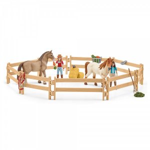 Osedlej koně a můžeš vyrazit. Ale až po dokončení prací ve stáji. Ještě štěstí, že s jezdeckou stájí z kolekce Schleich® HORSE CLUB je to taková zábava a nabízí vše, co ty i jezdec potřebujete. S masážním kartáčem, háčkem na kopyta a hřeblem upravíš arabskou klisnu i její hříbě v boxu pro hřebelcování během chvilky. Dobře vychovaní koně si poté opravdu zaslouží pamlsek – třeba mrkev nebo jablko? Nebo den v aquaparku s tobogány! A pokud budeš chtít předtím uklidit, díky vidlím bude stáj uklizená rychleji, než řekneš „jako ze škatulky“. Stáje budou jen zářit. Pomůžeš? Sada obsahuje: 1× dům, 3× box pro koně, 1× mycí stanice, 1× dřevěný kůň, 2× hrnek, 2× talíř, 1× pytel ovsa, 2× jezdecký klobouk, 2× balík slámy, 2× balík sena, 1× siláž, 1× kbelík, 2× kartáč, 2× jablko, 2× mrkev, 1× kočka, 1× myš, 3× kůň, 1× vidle, 1× koště, 2× deka pod sedlo, 2× spací pytel, 2× polštář, 1× kovbojský klobouk, 2× plně pohyblivá figurka Rozměry: 37,5 x 56,5 x 10,5 cm Věk: 3+