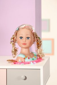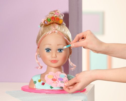 Vítejte v kosmetickém studiu pro malé princezny se smyslem pro ten nejlepší styl! Mladé make-up artistky mohou vytvářet ohromující make-up pomocí barevné a dermatologicky testované paletky s make-upem. Česací hlava s blonďatými vlásky prémiové kvality a jemnými barevnými melíry se snadno upravuje pomocí gumiček, sponek, skřipečků a kartáče. Ať už se budou tvořit romantické vlny, elegantní drdol nebo copánky a culíky – fantazii královských stylistů se meze nekladou. Vrchol elegance přichází ve formě jasně barevných nacvakávacích diamantů, kterými lze ozdobit třpytivou korunku nebo halenku. Jediné, co ještě chybí, jsou úžasné náušnice. A teď je princezna připravena oslnit všechny kolem.• Líčení a vlasy.• Pečlivě navržené doplňky rozvíjejí dětskou představivost a otevírají nové možnosti a témata hry.• Pro zábavnou a dlouhotrvající hru.Starší sestřička BABY born Česací hlava s paletkou s make-upem, kartáčem, 4 sponkami, 8 skřipečky, 4 gumičkami, korunkou a 14 nacvakávacími drahokamy.