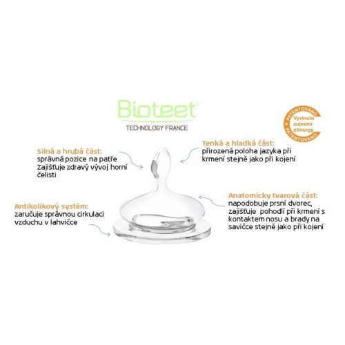 Inovativní savička Bioteet vyniká svým tvarem a povrchem, maximálně se přizpůsobuje dětským ústům, napodobuje tvar mateřské bradavky v dětské puse, u dítěte zajišťuje vynakládání stejného úsilí jako při kojení, a tím napomáhá správnému vývinu zubů. Díky svému asymetrickému tvaru a pečlivě navržené tloušťce zaručuje savička Bioteet přirozené tempo průtoku mléka, přirozené dýchání nosem, správnou frekvenci a způsob polykání a zabraňuje míchání vzduchu do mléka.