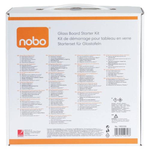 • Obsahuje: 4 popisovače na skleněné tabule, stěrku na skleněné tabule, čisticí pěnu Nobo, čisticí hadřík z mikrovláken Nobo a 4 extra silné magnety na magnetické tabule