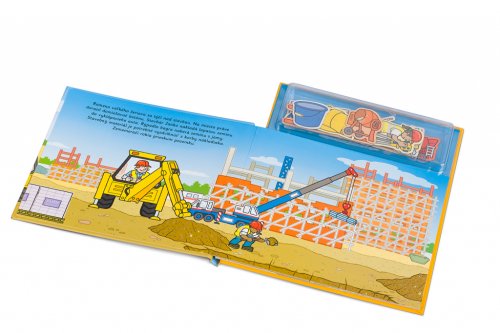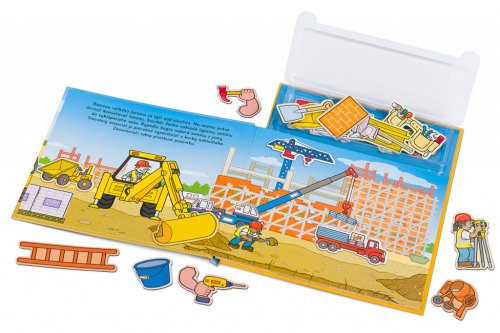 Na staveništi je pořád rušno – co se tam asi bude dít dnes? Jeřáb, míchačka, sklápěč, nejrůznější nářadí, ale třeba taky ochranná helma – to všechno je na stavbě potřeba. A těch dělníků a řemeslníků různých profesí! Na každé stránce téhle knížky objeví děti kratičký příběh, který mohou spoluvytvářet pomocí magnetek. A až si do sytosti vyhrají, mohou všechny magnetky zase pěkně uklidit zpátky do úložného boxu, kde budou připraveny na další skvělou zábavu.