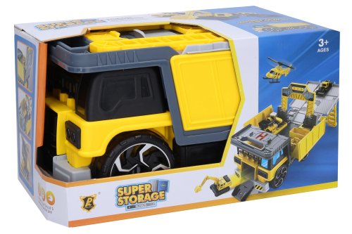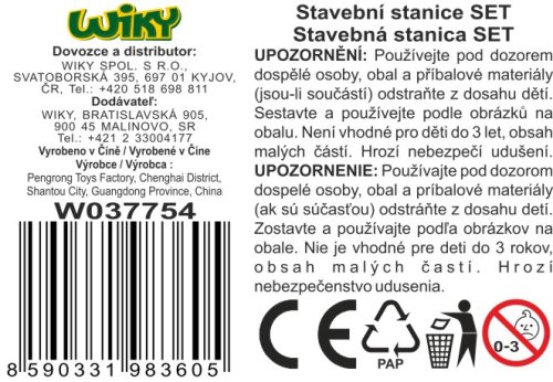 Stavební stanice set. Rozměry 25x15x14,5 cm. Obsahuje sklápěč stanici s volnými koly, 1 malé stavební auto (bagr), polepy. Používejte dle obrázků na obalu.