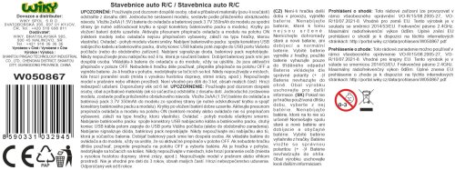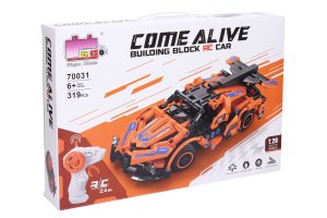 Stavebnice Auto oranžové RC na dálkové ovládání. 319 dílků. Rozměry 18,6x8,8x5,6 cm. Pistolový ovladač. Frekvence 2.4GHz. Bateriový pack 3.7V 350mAh Li-ion do auta součástí, 2xAA do ovladače nejsou součástí. USB kabel součástí. Přepínač ON/OFF na spodní straně auta a na boční straně ovladače. Obrázkový návod bez textu a nálepky součástí.
