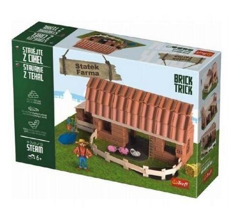 Staňte se stavitelem a vybudujte ze skutečných hliněných cihel a dřeva svůj vlastní statek! Skládejte cihlu za cihlou, řežte a lepte prkénka, postupujte od základů až po dokončenou budovu a nakonec svůj výtvor ozdobte přiloženými dekoracemi. Stavte krok za krokem podle návodu nebo najděte a zrealizujte své vlastní řešení. Oživte svou dokončenou stavbu papírovými figurkami. Pokud spojíte několik sad TREFL Brick Trick, můžete vytvořit malebnou vesničku, moderní město nebo středověkou osadu. Stavebnici lze používat opakovaně (lepidlo je rozpustitelné vodou). Úroveň obtížnosti: 4,5 Balení obsahuje: - více než 130 přírodních hliněných cihliček - více než 5 m dřevěných prkének - základovou desku - obrázkový návod - papírové figurky - dekorační doplňky - lepidlo Stavebnice Brick Trick od výrobce TREFL zlepšují manuální dovednosti, rozvíjí představivost a podporují soustředění. Vhodné pro děti od 6 let. Vyrobeno v EU.