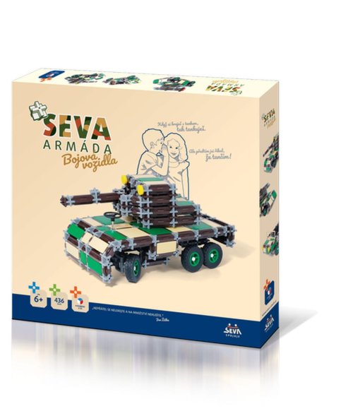 Stavebnice ve vojenských maskovacích barvách pro malé dobrodruhy a bojovnice. Postav děla, tanky, obrněné vozy nebo jinou vojenskou techniku podle svojí fantazie. Pevnost výtvorů můžeš prověřit hrou přímo v přírodě, kde si užiješ spoustu zábavy. Stavebnice SEVA Armáda – bojová vozidla nahrazuje stavebnici SEVA Army 1 a doplňuje novou kolekci SEVA Armáda společně s novými stavebnicemi Letectvo (dříve Army 2) a Speciální jednotka (dříve Army mini 1 a 2). Velkou výhodou stavebnic SEVA je její kompatibilita a možnost neomezené kombinace s ostatními stavebnicemi. Stavebnice obsahuje 436 dílů. Pokud byste si nevěděli rady, součástí balení je také podrobný návod ke skládání. Rozměry balení 35 x 33 x 5 cm. Vhodné pro děti od 6 let.
