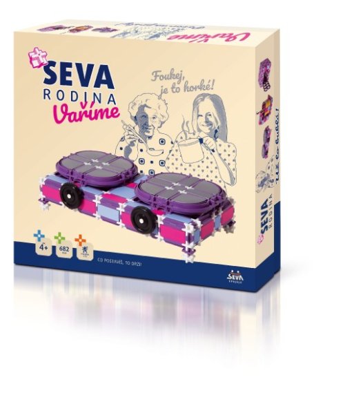 Stavebnice SEVA Rodina - Vaříme obsahuje 682 dílků, ze kterých si můžete sestavit kuchyňského robota, dvouplotýnkový vařič nebo mikrovlnnou troubu atd. Jedná se o jednoduchou konstrukci, která je navíc funkční. To znamená, že miskou i metličkou se v kuchyňském robotu dá otáčet a michát. Ovladače u vařiče jsou otáčecí a talířem v mikrovlnné troubě se také dá pohybovat a dvířka jsou otevírací. Rozměry balení 35 x 33 x 8 cm. Vhodné pro děti od 4 let.
