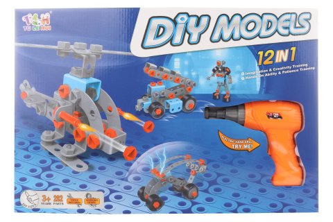 Šroubovací stavebnice s vrtačkou. Balení obsahuje celkem 282 dílů, vrtačku a šroubovák. Součástí balení je také návod. Napájení vrtačky je na 2 AA baterie (nejsou součástí balení). Rozměry balení cca 49 x 33 x 6 cm. Věk 3+
