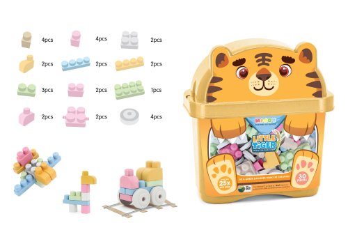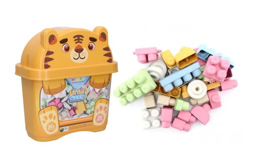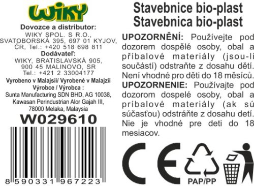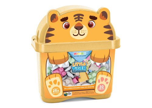 Stavebnice z bio-plastu. Balení obsahuje 30 kostek. V krabičce s víkem 25,5 x 14,5 x 28 cm. 25% plastové směsi tvoří rýžové slupky.