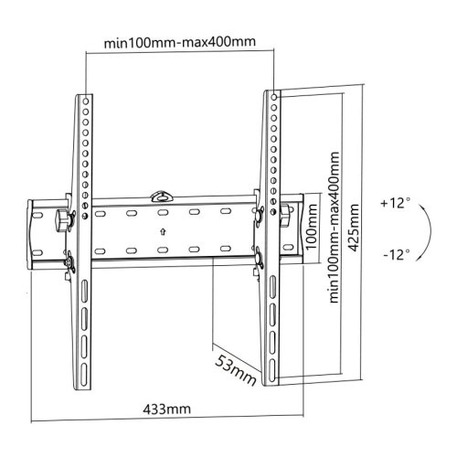 Nosnost držáku je až 40 kg, rozměry 42,5 x 43,3 x 5,3 cm s náklonem dolů 12°. Minimální vzdálenost od zdi je 5,3 cm.