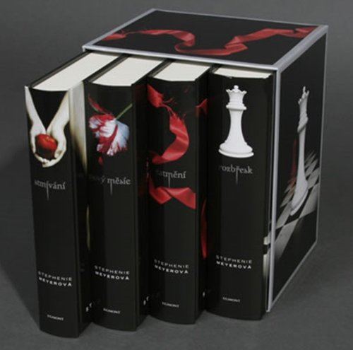 Box obsahující všechny 4 knihy romanticko-hororové ságy: Stmívání, Nový měsíc, Zatmění a Rozbřesk.